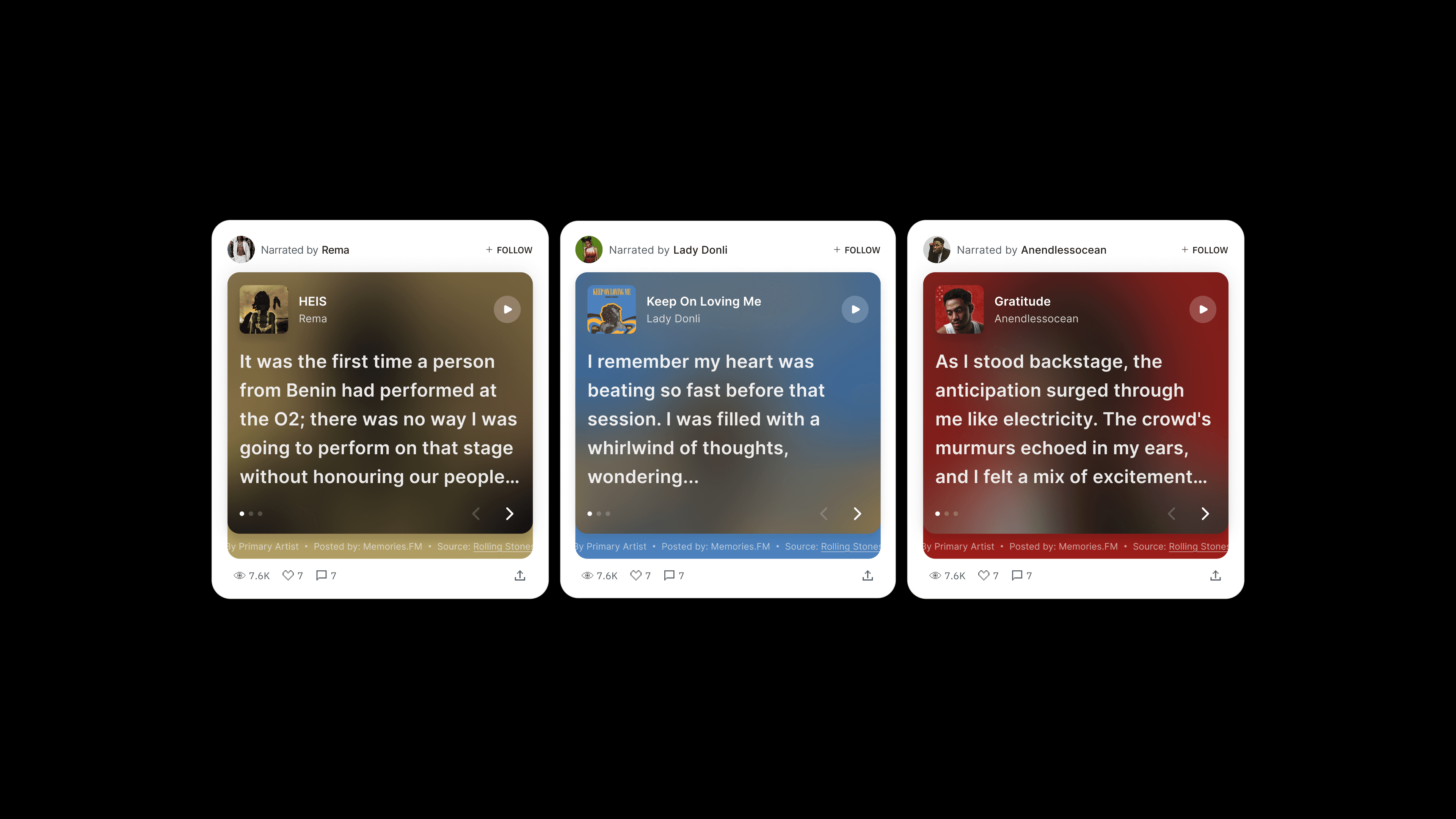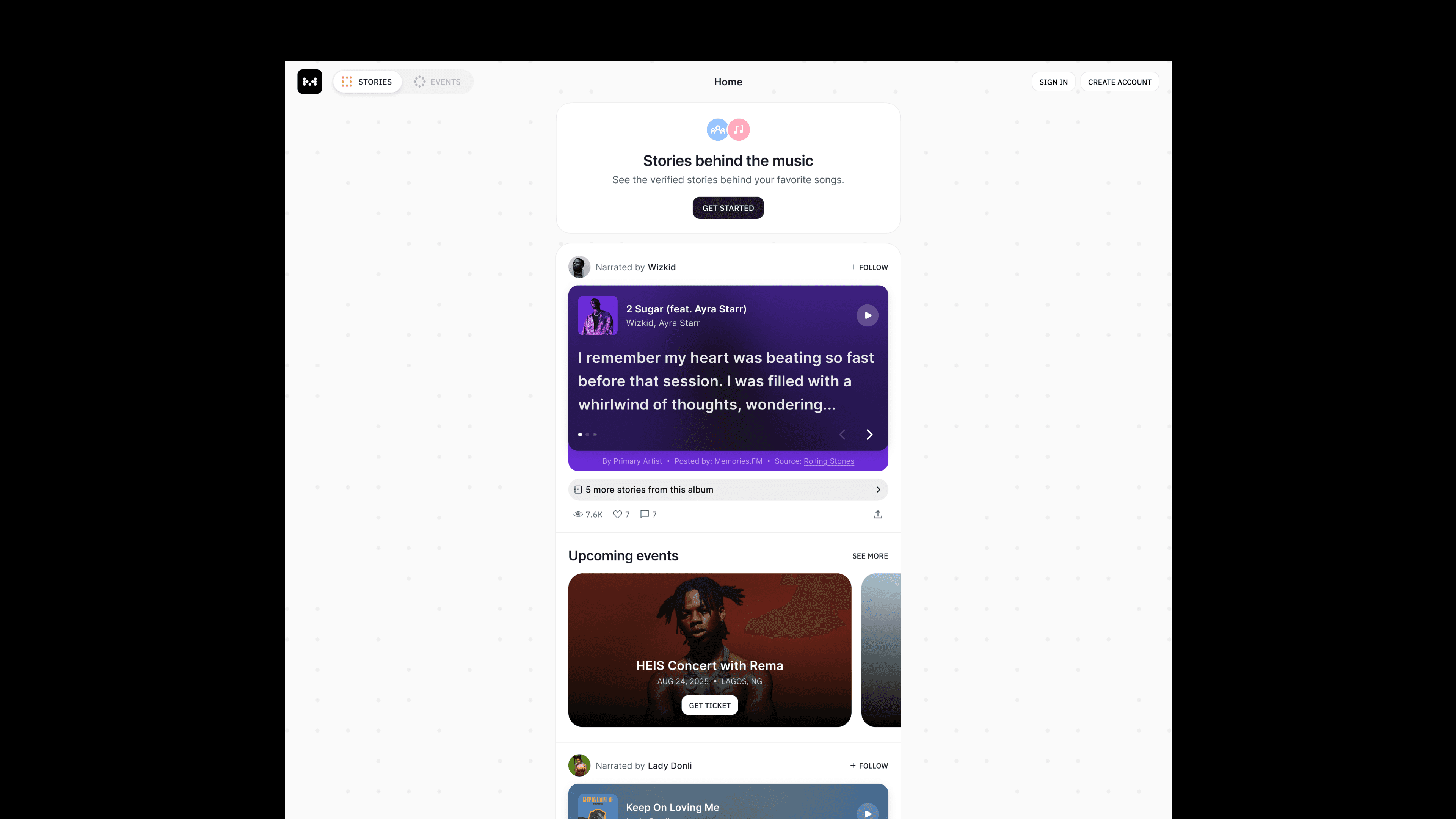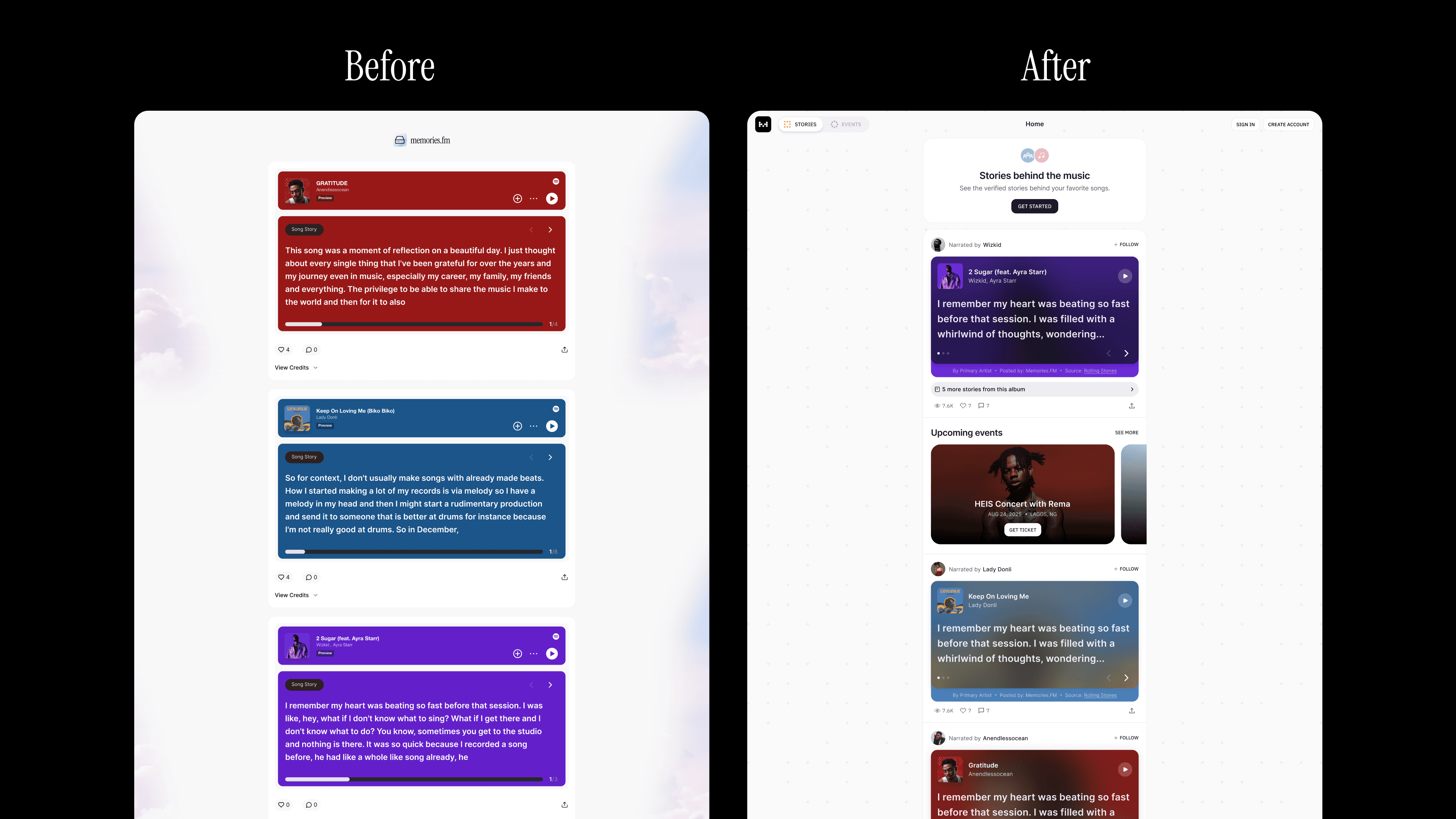 Memories.fm is a platform where fans discover the real stories behind their favorite songs, told directly by artists. After a rebrand, the team wanted the new product experience to reflect its updated identity and emotional tone. My task was to redesign the platform to make it more engaging and intuitive while introducing an Events feature that allows fans to buy tickets to artist shows, deepening both emotional and real-world connection.